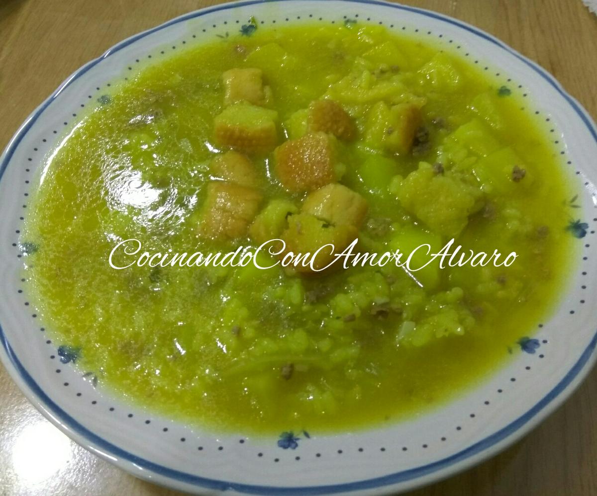 Cuando las patatas y el arroz estén cocidos, agregamos los picatostes de pan en dados. Que de empapen con el caldo.