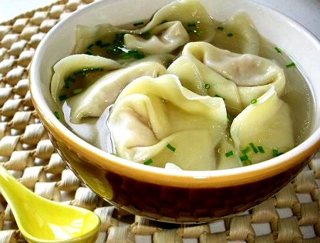 Llevar a cocción un litro de agua en el wok. Al romper la ebullición, agregar solo una parte de los wantanes (seis) y dejamos hervir por un minuto. Adicionamos dos tazas de agua hervida fría, retirar y escurrir los wantanes. Repetir el proceso con las otras porciones.