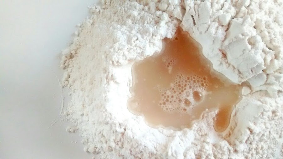 En un jarro, mezclar la levadura (si es en sobre) con el agua tibia y la sal. Luego en un bowl o en una superficie limpia, poner el 1/2 kg de harina y hacer un huequito para ir añadiendo de a poco la mezcla del agua (quedará como un volcán).