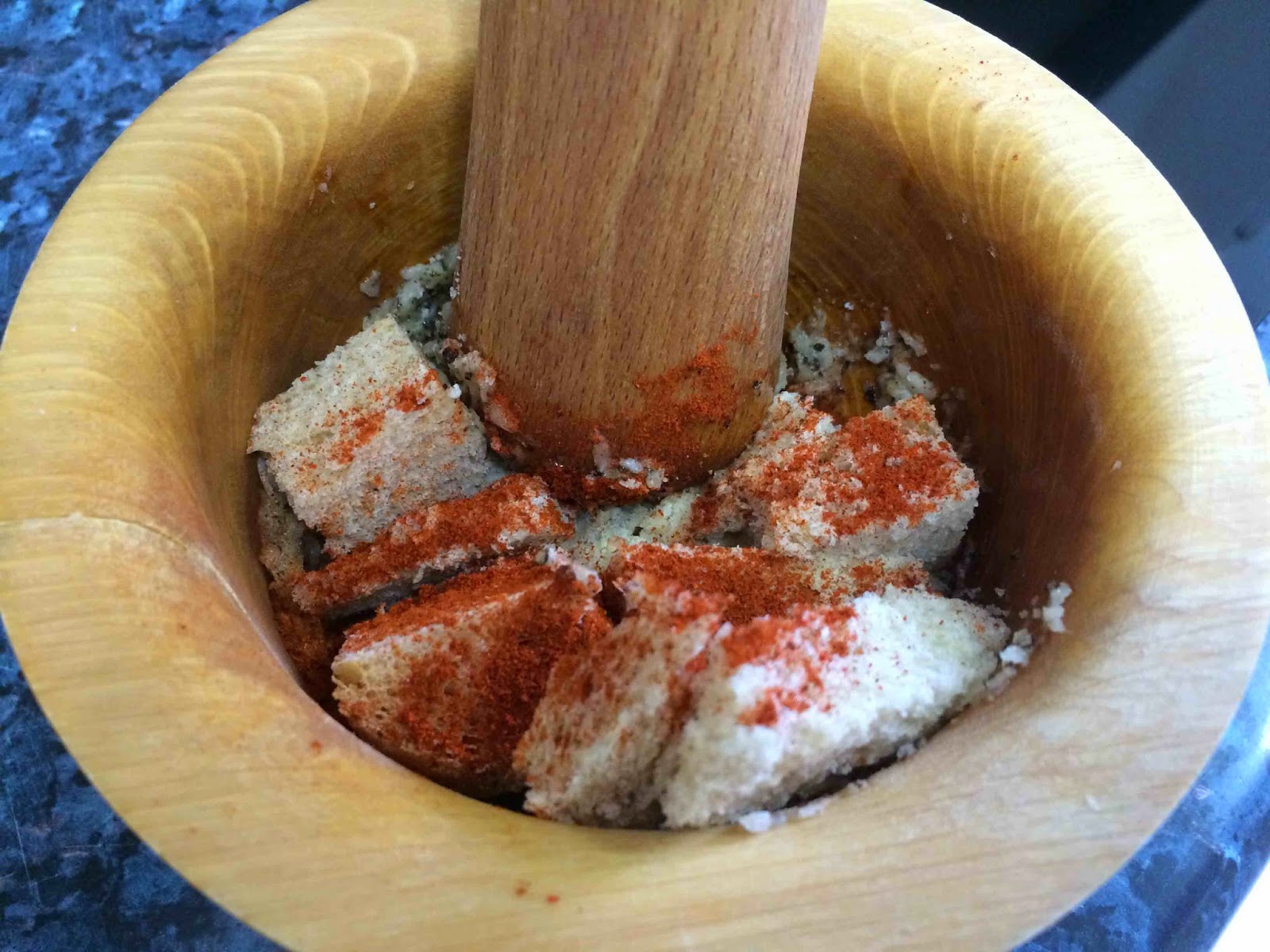 Añadimos la miga del pan y media cucharadita de pimentón dulce. Agregamos un poco del agua que tenemos hirviendo en la cacerola y trabajamos bien en el mortero.