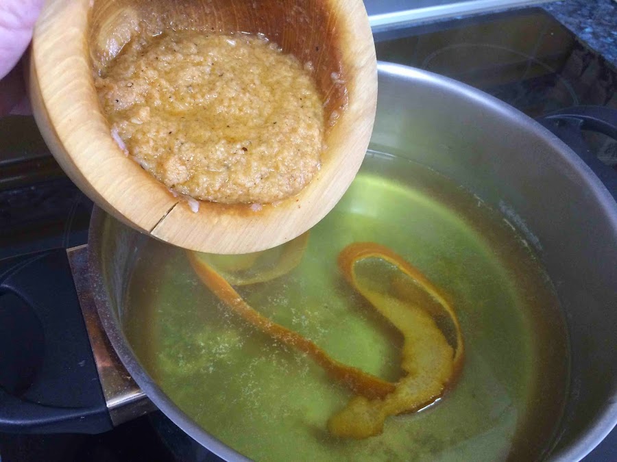 Antiguamente se utilizaba las cáscaras de naranjas secas para preparar estas sopas. Hoy en día no tenemos costumbre en las casas de secarlas así que se suele hacer con la cáscara de una naranja fresca.