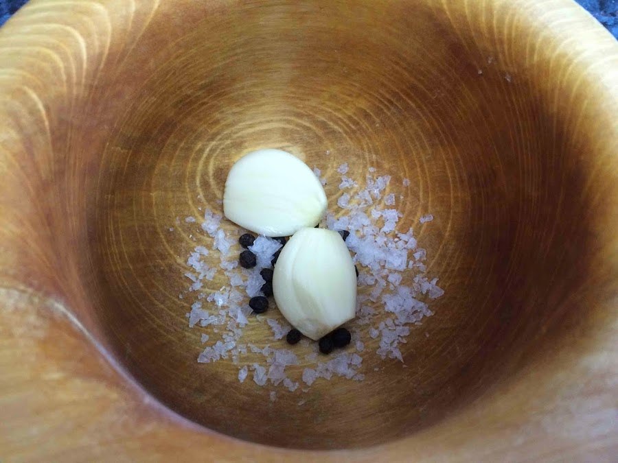 En un mortero ponemos los dos dientes de ajo pelados, la pimienta en grano y un poco de sal. Comenzamos a hacer nuestro "majaíllo".