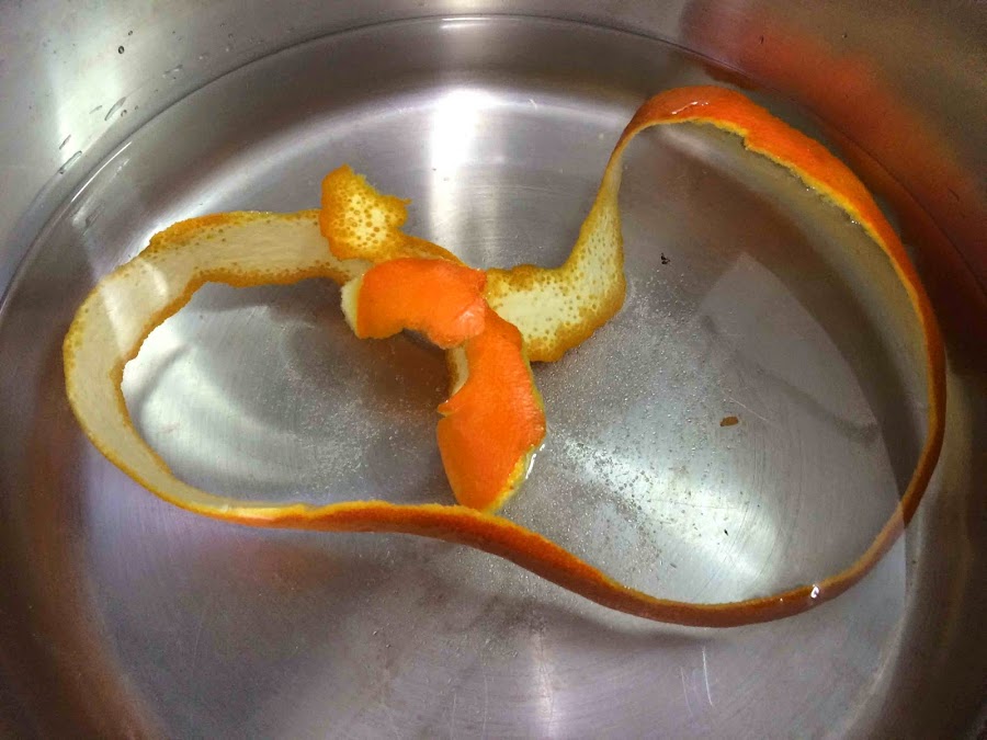 En una cacerola amplia ponemos dos litros de agua a hervir junto con la cáscara de naranja y un pellizco de sal. Es importante que lavemos muy bien la cáscara antes de utilizarla.