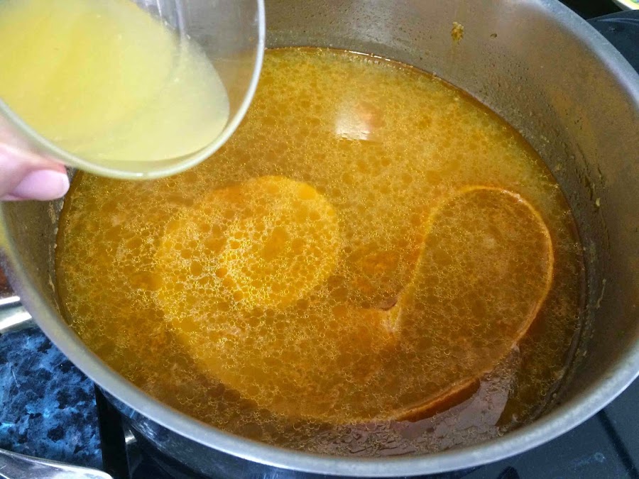 Al final le añadimos el zumo de la naranja agria y el bacalao desalado.