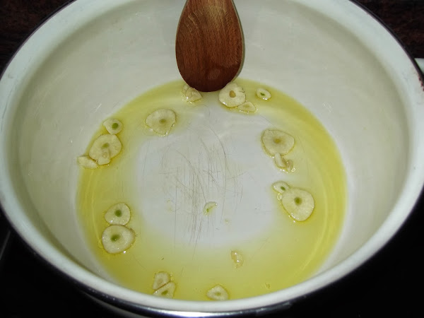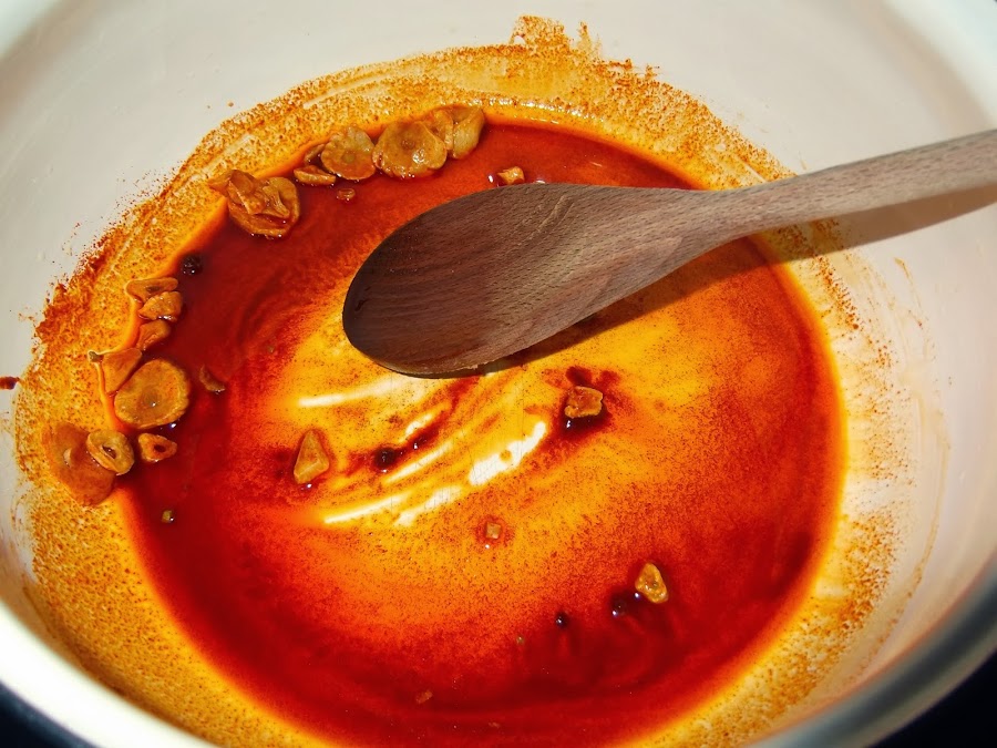 El siguiente paso es echar en una cacerola un poco de aceite de oliva y los ajos fileteados, cuando veamos que han cogido un color dorado, retiramos la olla del fuego y añadimos la cucharada de pimentón. Como os he explicado en otras recetas, esto es para que no se queme el pimentón.