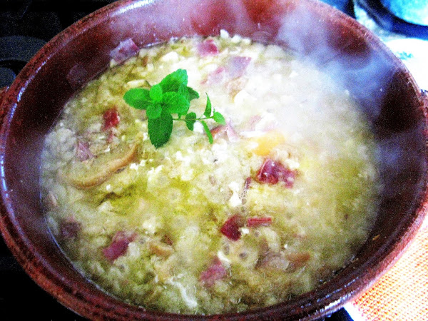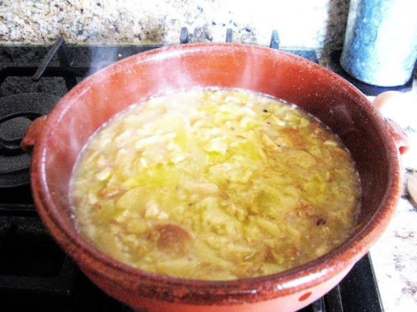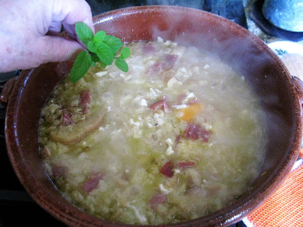 Cocinar dos o tres minutos más, poner la hierbabuena, retirar y esperar unos minutos a que la sopa tome el sabor de la hierbabuena. El barro guarda muy bien el calor, no se va a enfriar, os lo puedo asegurar.