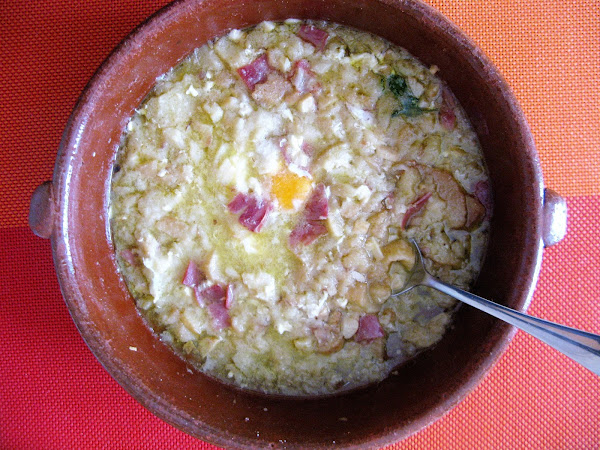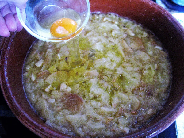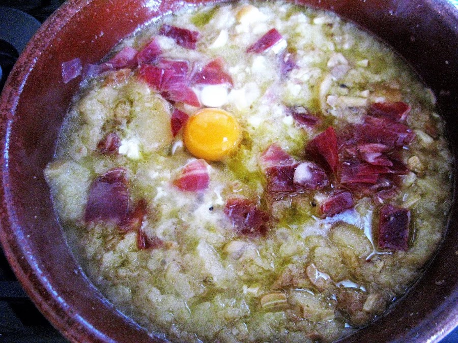 Agregar ahora el huevo o huevos (uno por persona), dejar que cuaje la clara y esparcir el jamón por toda la cazuela.