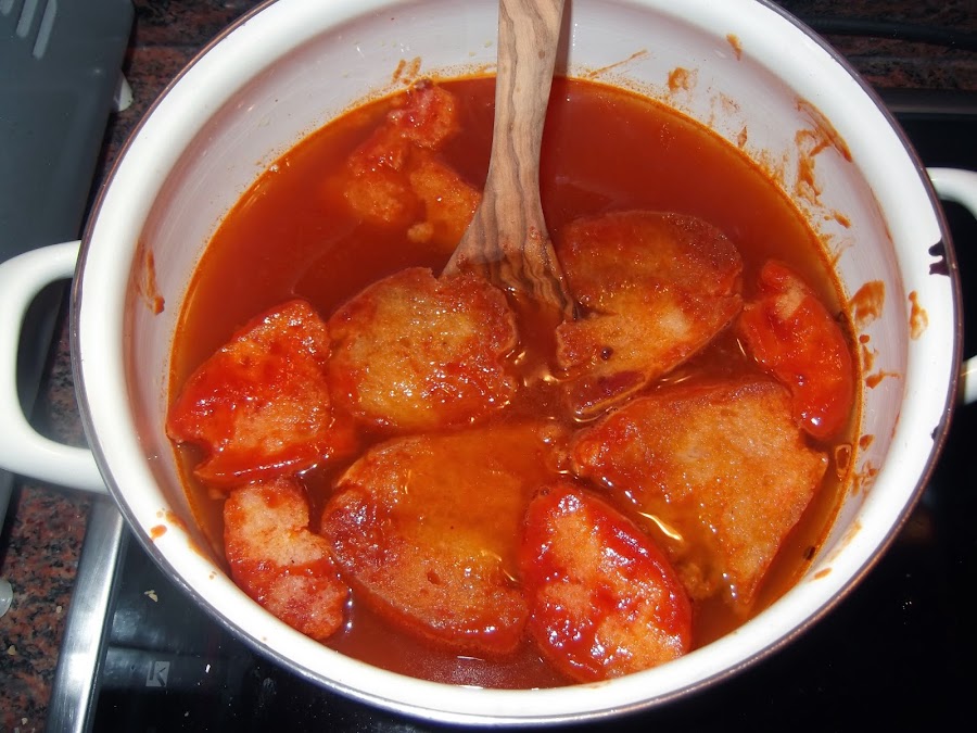 Una vez que el pan está bien empapado, retiramos la cazuela del fuego y le echamos el pimentón, dejamos que se dore, sin que llegue a quemarse y vertemos la salsa de tomate, la pulpa del pimiento choricero y el agua caliente. Sazonamos y dejamos que cueza despacio durante 20 minutos.