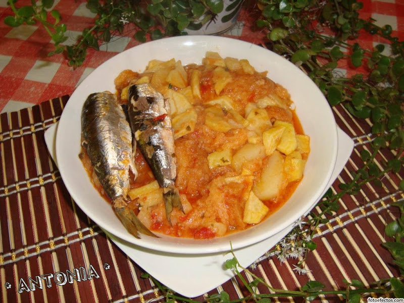 Ingredientes para None comensales Sardinas 12 unidades aceite de oliva extra azafrán laurel 2 hojas tomates maduros 2 unidades cebolla mediana 1 unidad patata mediana 4 unidades ajo 2 dientes sal marina Limpiar y desespinar las sardinas (abriéndolas al medio) pelar las patatas y cortarlas en rodajas. En una olla ponemos un buen chorro de aceite, sobre éste, una capa de patatas en rodajas, otra ...