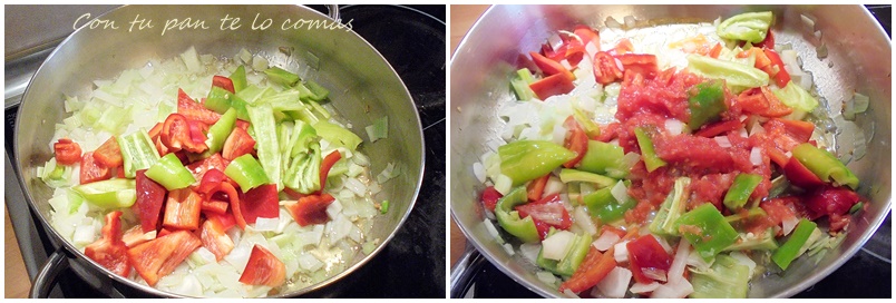 2. Incorporamos los pimientos en trozos , rallamos los tomates, sazonamos con sal y dejamos hacer el sofrito un ratito, antes de agregar más verdura.