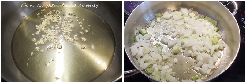 1. Empezamos sofriendo los dientes de ajo picaditos en aceite de oliva. Como es la única grasa que van a llevar ponemos suficiente aceite cubriendo el fondo de la olla. En cuanto los ajos tomen un poco de color añadimos la cebolleta también picada para pocharla.
