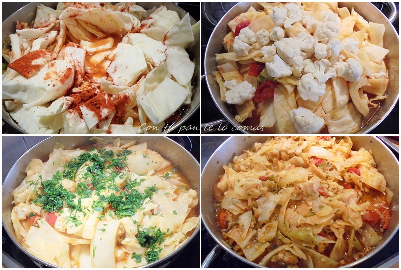 3. Una vez hecho el sofrito añadimos la col troceada, el pimentón y la coliflor en ramitos. Cubrimos con agua y sazonamos de nuevo con sal. Añadimos un buen puñado de perejil fresco picado y tapamos la olla para que se vaya haciendo toda la verdura. Se puede añadir cualquier otra verdura como alcachofas, habas, judías verdes, etc, a tu gusto.
