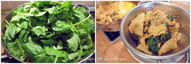 4. Al haber elegido espinacas que tardan muy poco en hacerse, hay que esperar a que el resto de la verdura esté hecha para añadirla. Tapamos de nuevo la cazuela y esperamos unos pocos minutos hasta que la espinaca esté tierna pero lógicamente si no le pones espinacas, este paso no será necesario.