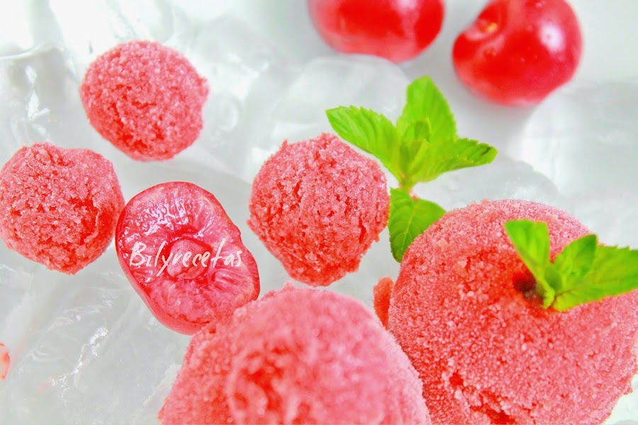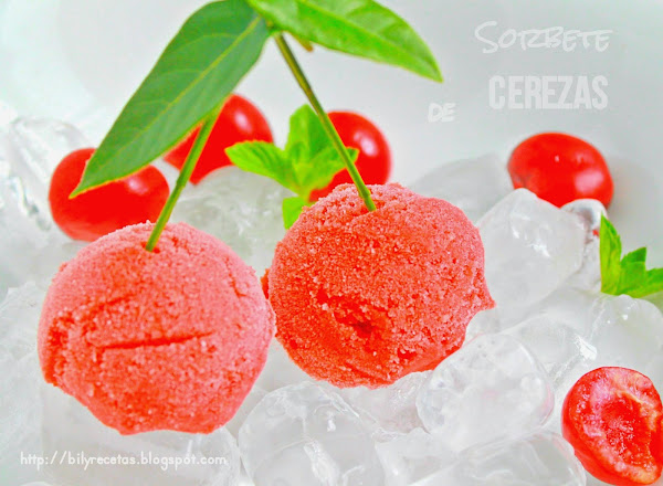 Para empezar limpiamos las cerezas de los huesos. Necesitaremos aproximadamente un kilo de fruta ya limpia. Mientras, ponemos a hervir el agua con el azúcar para hacer el almíbar. Cuando empiece a hervir dejamos un minuto al fuego y retiramos hasta que se enfrié. Trituramos las cerezas con la ayuda de una batidora eléctrica y colamos bien por un colador fino hasta eliminar toda la pulpa sobrante. En la pasta de cerezas añadimos el zumo de un limón y el almíbar ya frío, removemos bien y guardamos en un recipiente que cierra herméticamente. Ponemos en el congelador por una media hora. En las primeras horas iremos sacando la mezcla cada media o una hora e iremos removiendo bien el sorbete que poco a poco ira cogiendo la textura deseada. Con 3-4 veces tendréis bastante. Si disponéis de maquina heladora lo podéis hacer allí, yo lo he hecho sin ella. Servir bien frío ya que se deshace muy rápidamente a temperatura ambiente. El resultado es un sorbete con intenso sabor a cerezas naturales. Espero que os haya gustado.