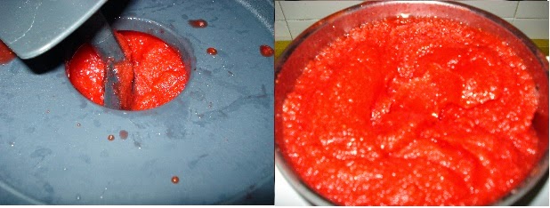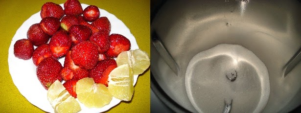 Ponemos en el vaso de la batidora las fresas, el zumo del limón y el azúcar. Lo trituramos muy bien.