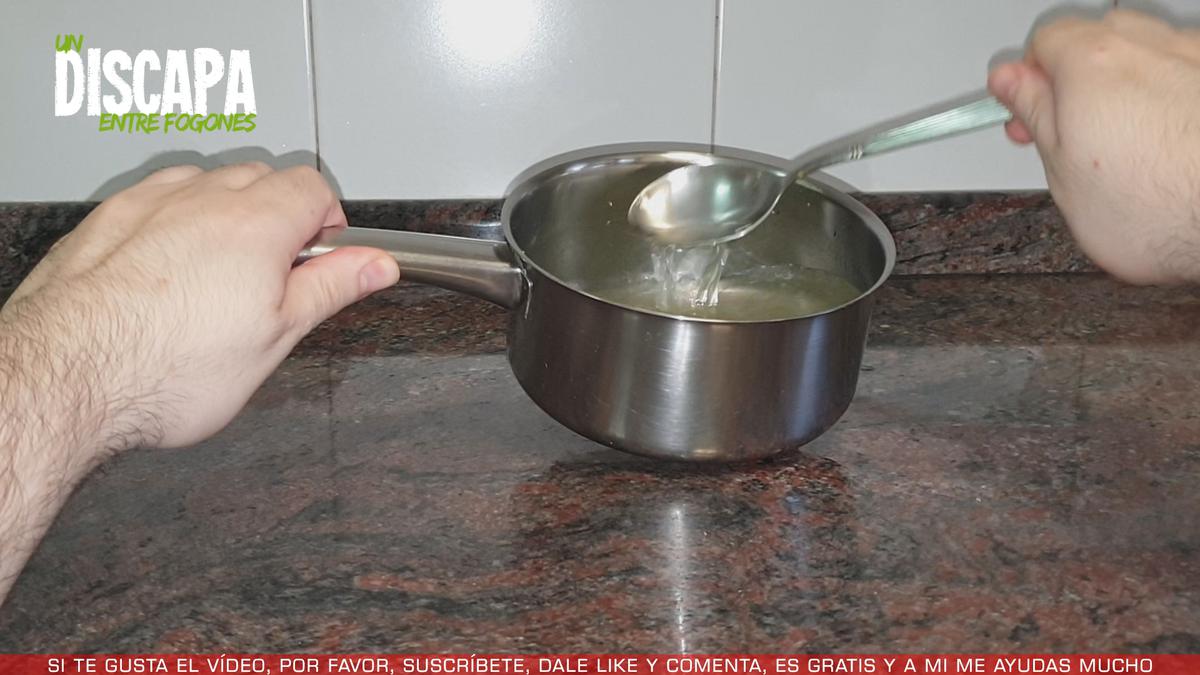 1 Para hacer este delicioso sorbete, lo primero que haremos será añadir el agua y el azúcar en un cazo y a fuego medio dejamos que el azúcar se vaya disolviendo. Una vez que el azúcar se ha disuelto apartamos el cazo del fuego y dejamos que se enfríe.