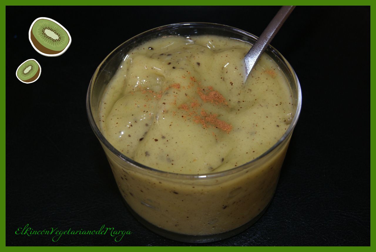 Sacamos los kiwis congelados y los metemos en un vaso de batidora, le añadimos un poco de agua para poder triturar mejor, una cucharada de canela y dos o tres cucharadas de sirope para endulzar. Batimos el tiempo necesario, hasta que queden todos los kiwis triturados. Quedará una mezcla homogénea y densa. Se debe consumir rápido, ya que en pocos minutos se derrite. Las fotos que he puesto son de al cabo de unos minutos (cuando ya me había comido uno ;))