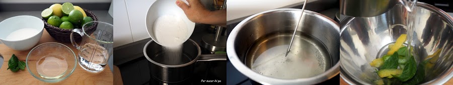 Retirar del fuego y verter el almíbar en un bol sobre la piel del limón y la lima y algunas hojas de albahaca.