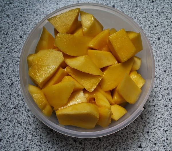 1/4 de cucharadita de cardamomo PREPARACIÓN - Empezamos congelando el mango. Para ello, lo pelamos y lo cortamos en trozos.