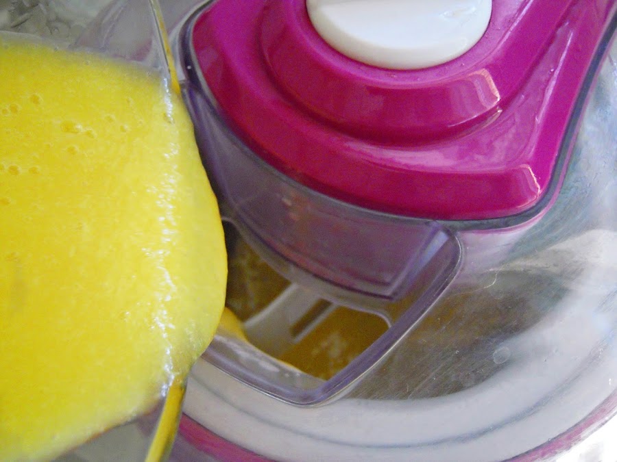 Coloca en la jarra de la batidora los trozos de melocotón, añade el zumo de limón y tritura todo junto.
