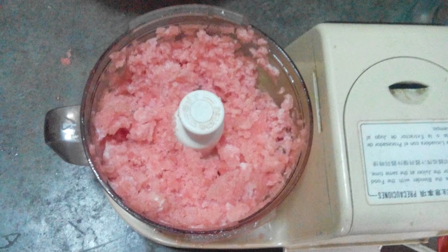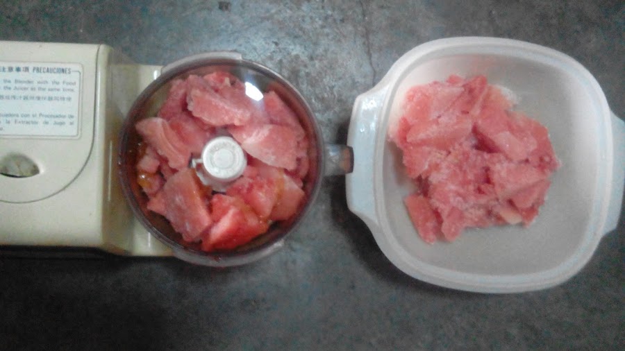 Congelamos los trozos de sandía la noche anterior para que estén bien firmmes. Los colocamos en un procesador de alimentos junto con la miel y yogurt.