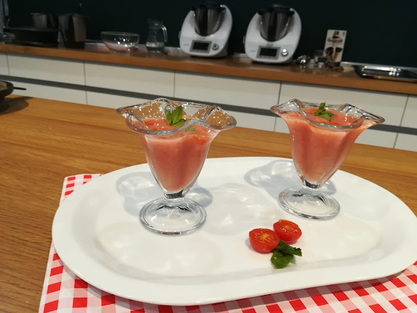 PREPARACION: 1.- Ponga en el vaso los tomates, los limones, el azúcar, la albahaca y el hielo. Introduzca la espátula por la abertura y muévala de lado a lado mientras tritura 1 min/vel.5-10 progresivamente. Sirva en copas y decore con las semillas reservadas.