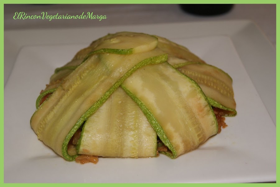 Laminamos con una mandolina los calabacines a una grosor media y cocemos las láminas en agua con sal hasta que estén bastante tiernas (no deben cocinarse mucho ya que al manipularlas se romperían, deben quedar entre tiernas y al dente). Las escurrimos y las ponemos a secar en un paño de cocina.