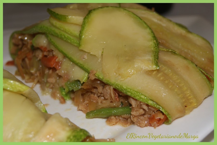 Preparamos el relleno. En un poco de caldo vegetal hidratamos la soja texturizada durante unos 5 minutos. Troceamos las judías verdes y las hervimos unos minutos en agua con sal. Cuando estén tiernas, las escurrimos. Troceamos la cebolla y el puerro y lo sofreímos en un wok con un poco de aceite de oliva hasta que tomen color. Seguidamente añadimos las zanahorias previamente peladas y troceadas, añadimos los dos vasos de caldo vegetal, la salsa de soja y las dos pimientas. Añadimos la soja texturizada (el caldo se puede utilizar o desechar) y las judías verdes cocidas. Mezclamos bien y dejamos que se consuma el caldo. En el plato de presentación, extendemos las láminas de calabacín a modo de círculo, dejando el centro bien repleto de calabacín para que no se salga el relleno e incorporamos los ingredientes del wok en el centro. Cerramos las láminas de calabacín una a una formando un paquetito. Servir caliente.