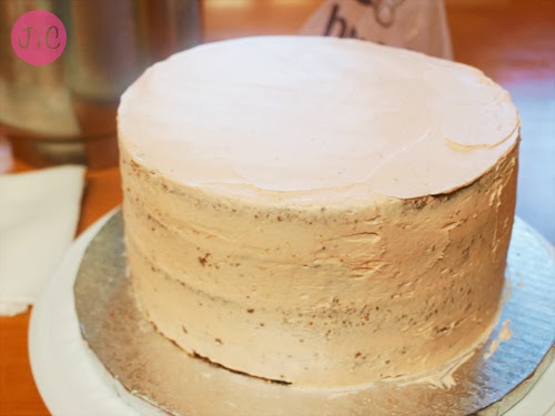 - Cubrimos toda la tarta con una fina capa de buttercream de fresa. Es la capa para sujetar las migas. Cuando la hayamos cubierto lo metemos al menos media hora en el frigorífico.