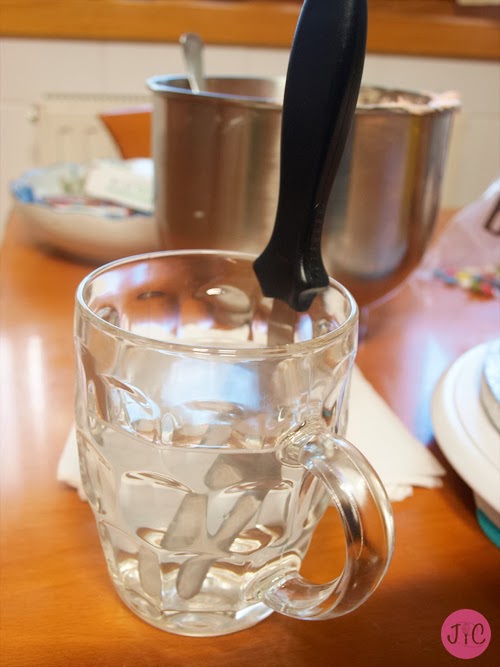 - Cuando esté extendido de forma uniforme, calentamos un vaso de agua y metemos dentro la espátula.
