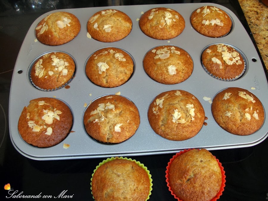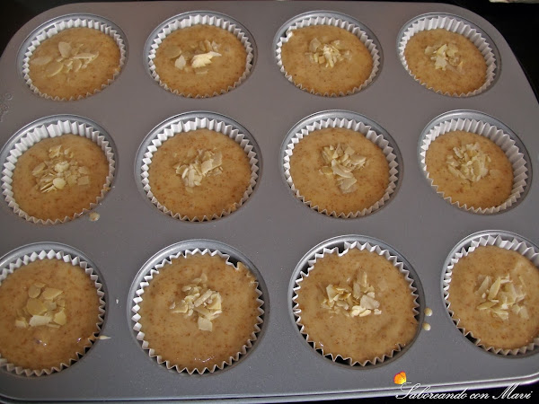 Lo repartimos en las cápsulas de magdalenas ( hay suficiente para 14) y le ponemos unas almendras laminadas encima.