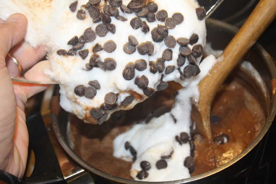 y después la otra mitad junto a las pepitas de chocolate.
