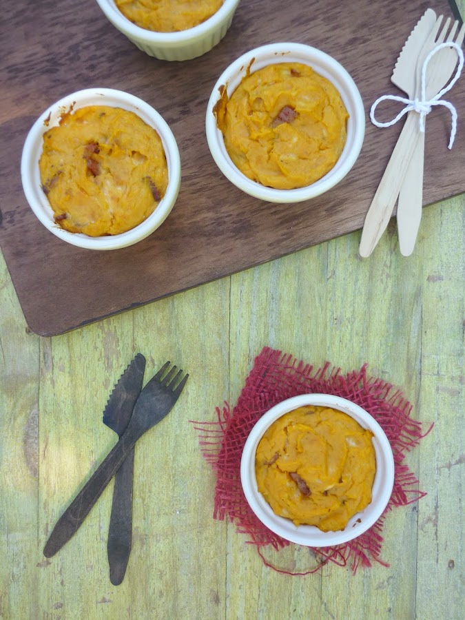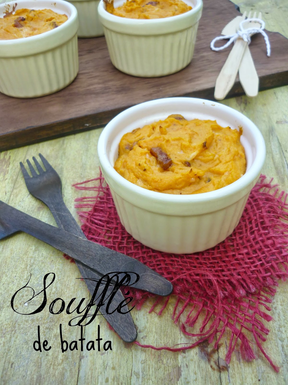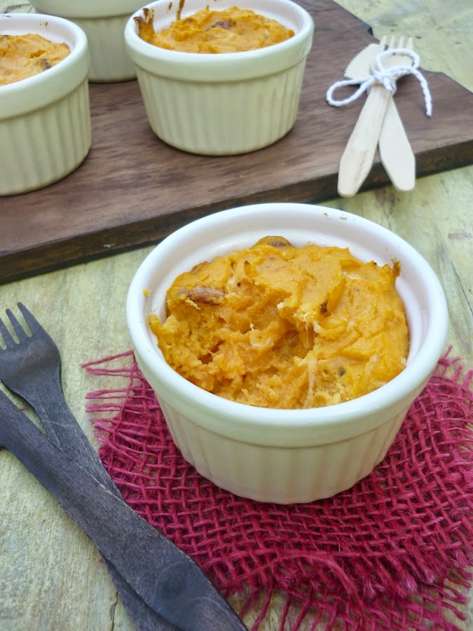Me encantan los souflés, este no es el primero que hago aunque si el primero que publico. Habitualmente lo hago con patatas, pero como la batata me encanta le di el cambiazo y el resultado fue un éxito. Incluso los recalenté al micro y seguían riquísimos.