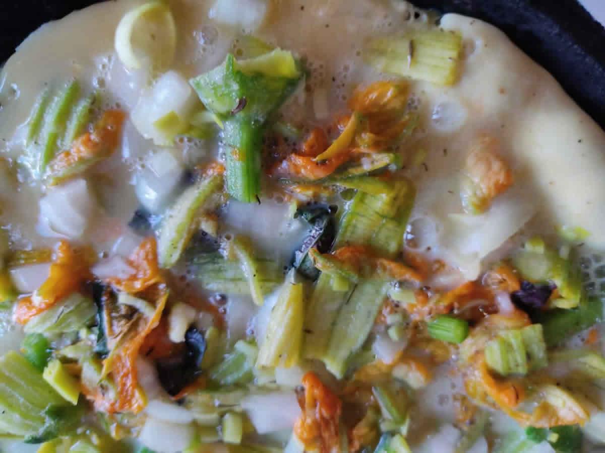 En un recipiente ponemos los huevos batimos un poco y le vamos agregando la cebolla, ajo, tomillo y sal mezclamos agregamos la mitad del queso, colocamos las flores y la albahaca movemos suavemente para mezclar sin marchitar demasiado las flores