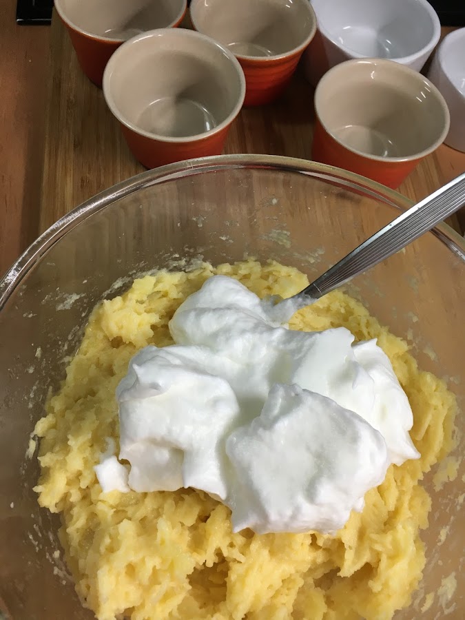 Se añaden a la mezcla de patatas y queso, con cuidado para que no se bajen. Por ello removemos con movimientos envolventes.