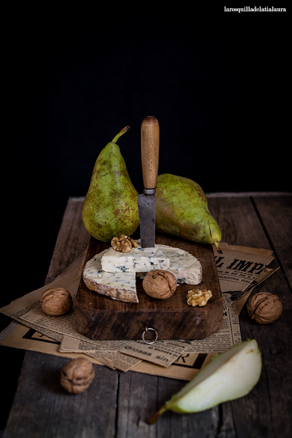 Esta vez lo he preparado con un queso azul traído de Normandía, unas peras pochadas a moso de compota y unas nueces de California troceadas.