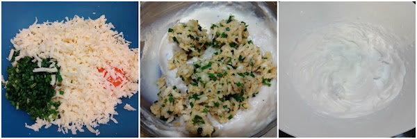 Separamos la yema de la clara y montamos esta última con una pizca de sal a punto de nieve. Mezclamos la yema, el queso rallado y el cebollino picado con la bechamel. Poco a poco, incorporamos la clara montada a punto de nieve con movimientos envolventes a la bechamel.