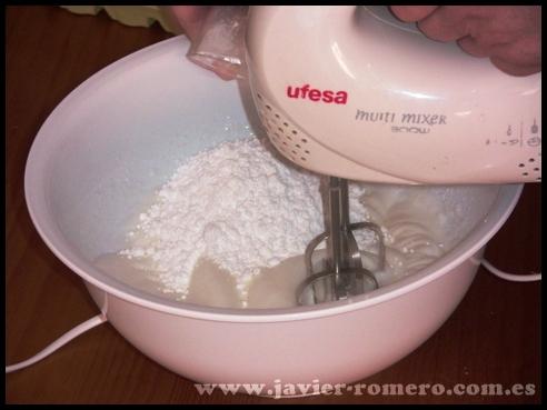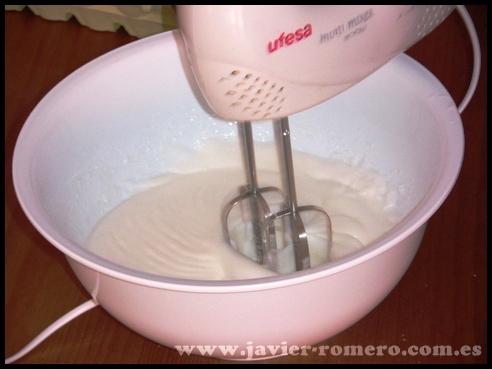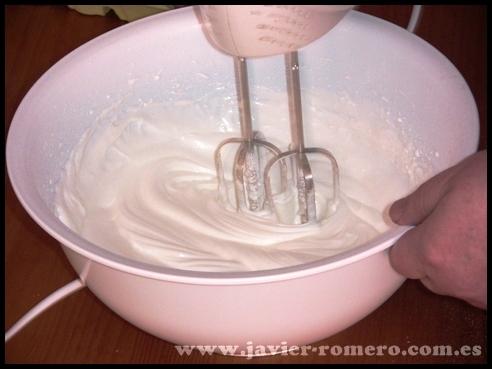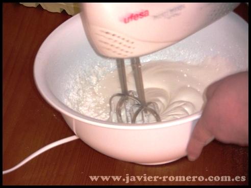 Por otro lado hago el merengue, para ello pongo en el bol las claras de huevo a temperatura ambiente y con el batidor comienzo a levantar las claras, cuando ya estén a punto de nieve le añadimos el azúcar glas y continuamos batiendo hasta que vemos que aunque le demos la vuelta al bol, el merengue no se va a mover.