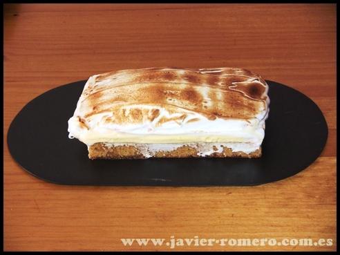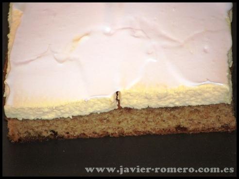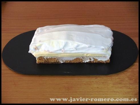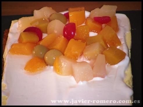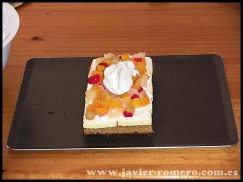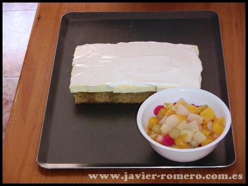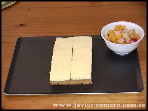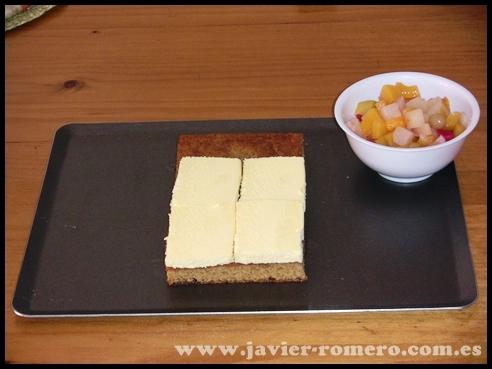 Con todos los elementos preparados, ponemos la plancha de bizcocho en la bandeja y lo emborrachamos con el almíbar. A continuación le ponemos encima el helado de vainilla. Lo cubrimos con un poco de merengue para que se fije bien la fruta y finalmente la cubrimos con el resto del merengue.