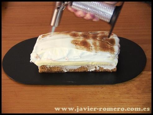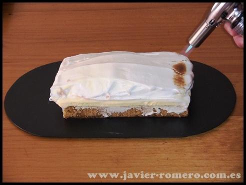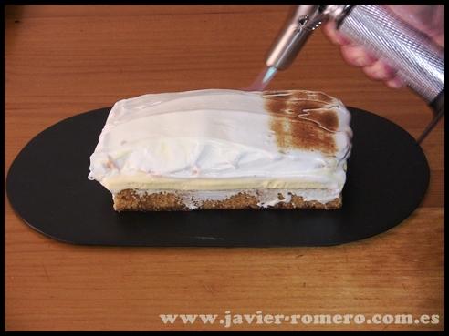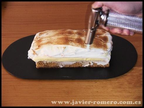 Aquí habría que rematarlo en el horno donde lo doraríamos con el gratinador, pero ya que tenemos un soplete de chef, lo hacemos más fácil, con el soplete quemamos toda la superficie el merengue y a continuación flambeamos con Marraskino.