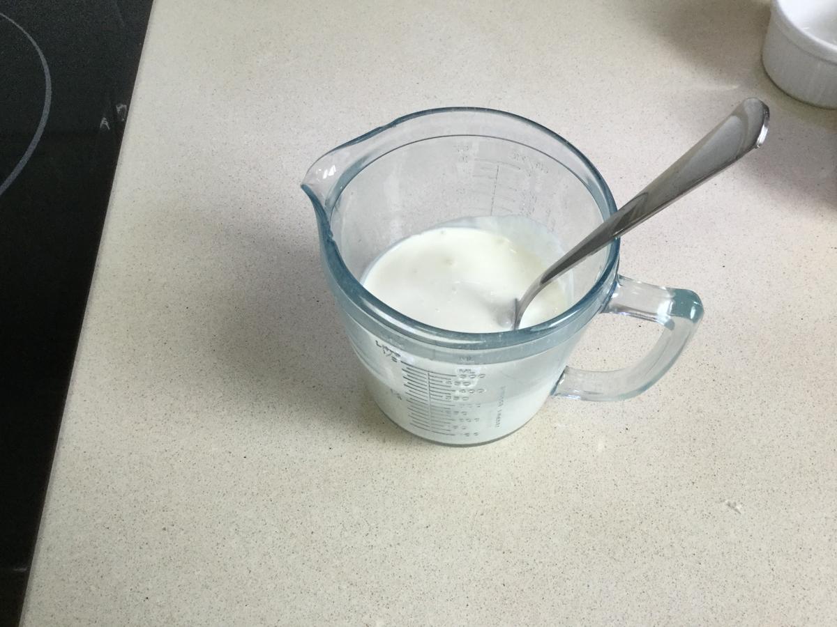 En la misma jarra medidora que contiene la nata (crema de leche) añadimos el zumo de limón y batimos con un tenedor. Comenzará a tomar consistencia casi de forma inmediata. Cuando notemos que cuesta un poquito batir le añadimos el vinagre y la sal.