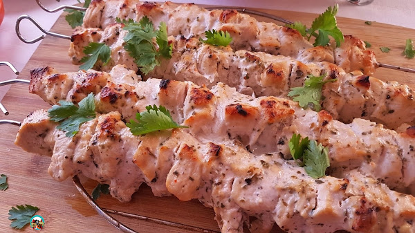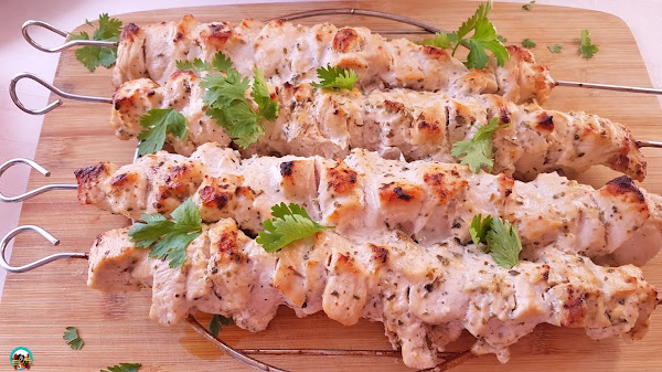 1.- En un bol ponemos el yogur griego con los dientes de ajos picados, el zumo de limón, el aceite de oliva, el orégano, la sal y la pimienta. Añadimos los trozos de pechugas, mezclamos bien con el resto de los ingredientes y dejamos que se macere 2 horas en la nevera o toda la noche.