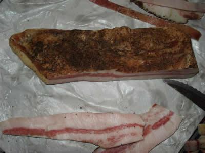 Cortamos en lonchas la panceta, luego en tiras y finalmente en cuadritos a nuestro gusto.
