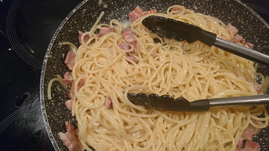 Ahora es el momento de incorporar los spaghetti a la sartén con la panceta. Les damos un buen salteado conjunto a fuego vivo, añadiendo un poco del agua de cocción.