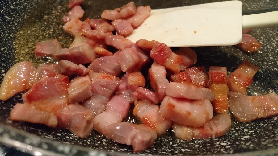Por un lado troceamos la panceta (evitad si podéis el bacon troceado y envasado, vuestro carnicero os dará producto de calidad) y la freímos en una sartén sin aceite. La panceta irá soltando su propia grasa y es la que nos interesa. Dejaremos hasta que se dore bien.