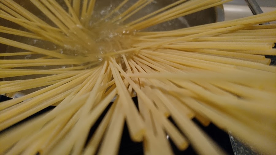Cuando empiecen los borbotones añadimos la pasta y dejamos cocinar según nos recomiende el fabricante de turno, aunque mi recomendación es que bajéis 2 minutos el tiempo que os digan. Necesitamos una pasta al dente y terminará de cocinarse con la salsa. La pasta "blandurria" no nos vale, nuestro morro es fino, no lo olvidéis...