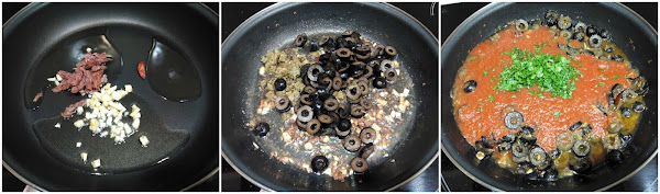 Ponemos unas 4 cucharadas soperas de aceite en la sartén e incorporamos las anchoas y los ajos picados y la cayena entera. Cocinamos a fuego medio hasta que las anchoas se deshagan. Incorporamos las alcaparras picadas y las aceitunas cortadas en rodajas. Cocinamos un par de minutos e incorporamos el tomate y un puñado de perejil fresco picado. Bajamos el fuego y cocinamos todo junto unos 15-20 minutos. Rectificar de sal si es necesario sólo al final de la cocción ya que las anchoas y las alcaparras son saladas (en mi caso no hizo falta).
