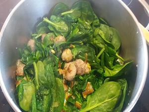 Cuando esté el aceite caliente, échalo a la cazuela y salpimenta. Deja que se ablande todo junto, a fuego medio, durante unos 3 minutos. Agrega las albondiguillas y saltéalas durante unos 3-4 minutos más todo junto.