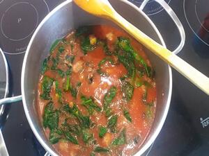 Añade las espinacas y cuando éstas se hayan reducido un poco y haya cambiado su color, incorpora el tomate triturado y una medida de la misma lata de agua. Deja que arranque el hervor.