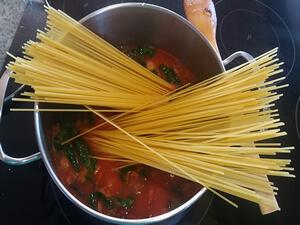 Cuando hierva, introduce los spaghetti. Ve ayudándolos a bajar conforme se vayan ablandando, para que se cubran bien con el tomate. Espolvorea las hierbas aromáticas que hayas elegido y deja cocer – medio tapado – hasta que la pasta esté a tu gusto (7-8 minutos aprox.).
